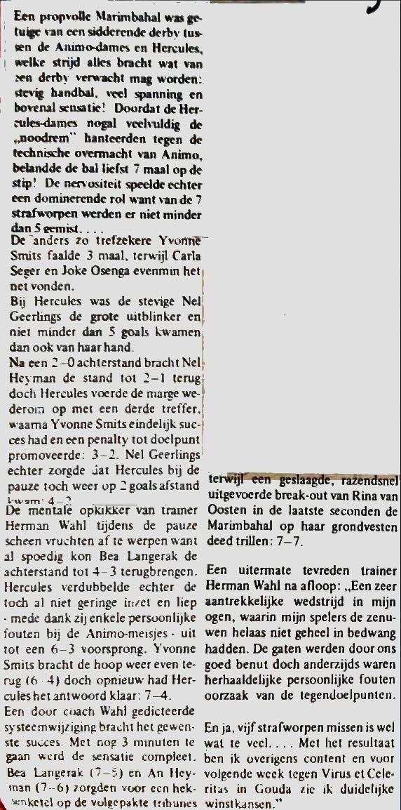 Olaf Kuijper: “heel wat 40+ ers hebben leren handballen in de marimbahal. Ik meen dat de zaterdagen voor “christelijk” animo waren, zondag “katholiek” Hercules. Heel wat Hercules leden zullen zich de beruchte zondagavonden (en maandagochtend) herinneren. Het huidige Hercules Heren HS 2 herbergt spelers zoals Maarten van Gerwen en Roy Houdijk, die tot de toenmalige selecties behoorden, en als (één van de) laatsten in de Marimbahal hun skills toonden alvorens wij naar Boswijk (Ypenburg) verhuisden.